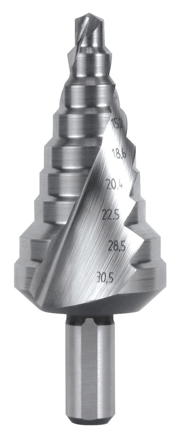 Trinbor HSS med dybslebet og spiralsnoet spånkanal, som giver et helt roligt løb og samtidig en meget stor skærekapacitet. Især ikke brækkende spåner transporteres meget let væk, akkurat som på et spiralbor. Dette formindsker samtidig at affald og koldsvejsninger sætter sig på skæret. Konussen for enden af trinboret letter tilbagetrækningen ved gennemboring af pladen. Anvendes til stål, støbegods, NE- og letmetaller. Fås i flere størrelser.